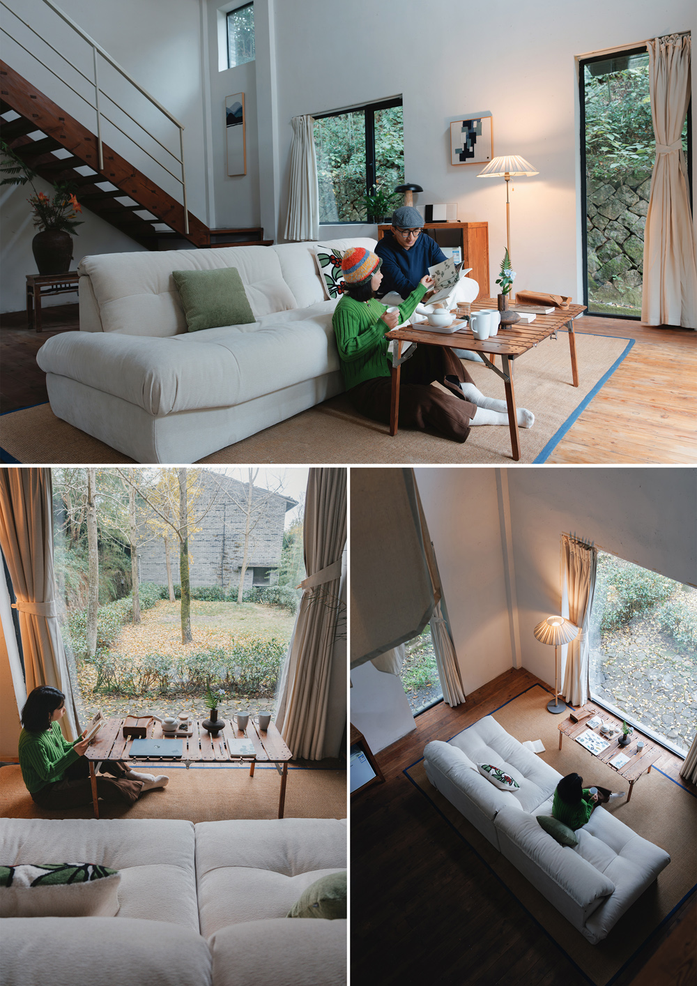 从都市白领转身为山中村民,他们的人生仿若按下重启键。在山林之中办公生活,通勤的烦恼消散于无形,生活的美好尽在眼前。超大落地窗前的全友沙发,成为了民宿里专属的舒适角落,躺在上面办公,闲暇时悠然休憩,消磨整日也不会觉得浪费。窗下有清风,耳畔有蝉鸣,目之是旷野,身后是山林,这便是@阿biu和二佳 在莫干山的旅居生活。